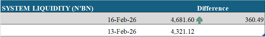 System liquidity commenced the week on a strong note, posting a surplus balance of ₦4.68 trillion, reflecting an increase of ₦360.49 billion compared to the previous session’s surplus position. The improvement was primarily driven by higher placements by Deposit Money Banks (DMBs) at the Central Bank of Nigeria’s (CBN) Standing Deposit Facility (SDF), which rose to ₦4.61 trillion. This was partially offset by ₦2.45 billion in Primary Market sales and ₦250 million accessed at the Standing Lending Facility (SLF) window.
