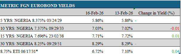 The African Eurobond market began the week on a relatively calm, albeit mildly positive, footing as investors responded to softer-than-expected U.S. January CPI data of 2.4% (vs. 2.7% forecast), reinforcing expectations of a potentially earlier rate cut by the Federal Reserve.