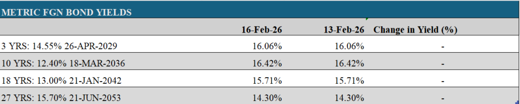 At the short end, yields were largely steady, with marginal increases recorded on the 17-Mar-27 and 23-Feb-28 bonds. In contrast, mild demand-led tightening was observed on the 20-Mar-27 and 20-Mar-28 issues.
