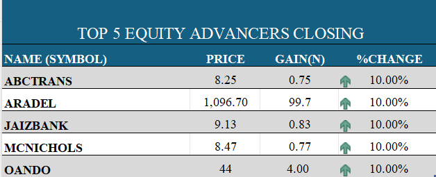 The Nigerian equities market closed positively as the All-Share Index (ASI) gained 436 basis points (bps), bringing year-to-date returns to 22.27%. Market breadth was strong, with 56 advancing stocks versus 27 decliners. Leading the gainers were ZICHIS, ABCTRANS, IKEJAHOTEL, MCNICHOLS, BETAGLAS, OANDO, and ARADEL, each up 10%, while RTBRISCOE topped the losers’ chart, declining 9.99%.