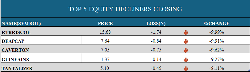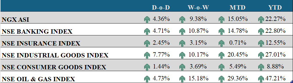 - The Oil & Gas Index climbed 473bps, buoyed by ARADEL (+10%), OANDO (+10%), and JAPAULGOLD (+9.96%).
