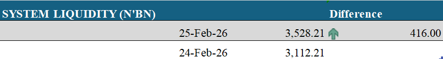 System liquidity opened the session in surplus at ₦3.53 trillion, representing an increase of ₦416.00 billion compared to the previous day. The improvement was largely driven by higher Deposit Money Banks (DMBs) placements at the CBN’s Standard Deposit Facility (SDF), which rose to ₦3.97 trillion, despite the settlement of ₦524.27 billion from the February 2026 bond primary market auction.