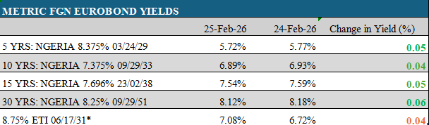 The African Eurobond market traded on a positive note, rebounding from the previous session’s risk-off sentiment. The recovery was supported by softer EU January CPI data of 1.7% (vs. 1.9% in December 2025), which strengthened expectations of a potential rate cut by the ECB. Sentiment was further influenced by renewed concerns over possible oil supply disruptions stemming from escalating tensions between the U.S. and Iran.
