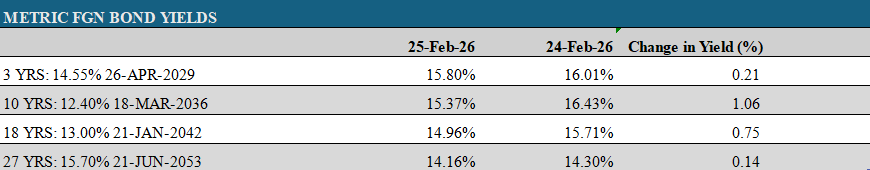 Selective demand was evident at the longer end, where the 04-Feb-27 bill declined by 15bps to settle at 15.40%. Meanwhile, short- to mid-tenors closed flat as market participants adopted a cautious approach.