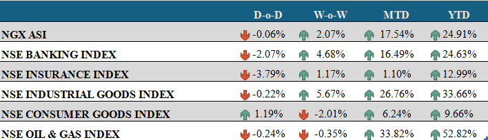 - The Oil and Gas Index lost 24bps, pressured by declines in JAPAULGOLD (-9.74%) and OANDO (-4.30%), while ETERNA (+1.23%) provided some support.