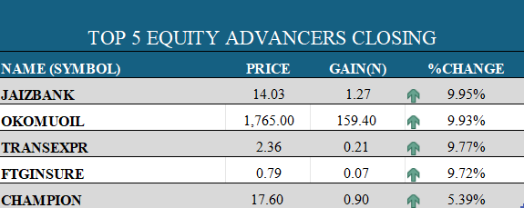- The Consumer Goods Index advanced by 119bps, supported by CHAMPION (+5.39%), BUAFOODS (+3.47%), and DANGSUGAR (+3.45%). Nonetheless, declines in INTBREW (-1.02%), HONYFLOUR (-1.08%), NB (-1.84%), CADBURY (-3.04%), PZ (-3.85%), and VITAFOAM (-9.93%) moderated the upside.