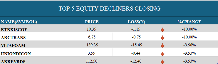 Market breadth was weak, with 21 gainers against 54 decliners. OKOMUOIL (+9.93%) led the gainers, while RTBRISCOE (-10.00%) and ABCTRANS (-10.00%) topped the losers’ chart.