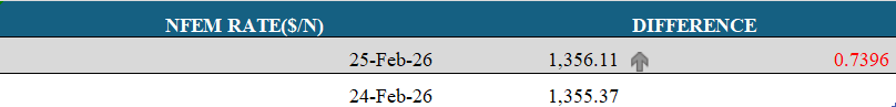 During the session, the Naira traded within a range of ₦1,353.00/$ to ₦1,361.50/$, before settling at ₦1,356.11/$. Meanwhile, external reserves rose to $49.39 billion as of 24 February 2026, reflecting a day-on-day increase of $120.05 million.