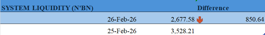 System liquidity opened the session in surplus at ₦2.68 trillion, representing a decline of ₦850.64 billion from the previous day. The moderation was primarily driven by a reduction in Deposit Money Banks’ (DMBs) placements at the CBN’s Standard Deposit Facility (SDF), which declined from ₦3.97 trillion to ₦3.71 trillion. This was largely offset by the ₦1.11 trillion settlement from the OMO auction conducted the previous day across the 6-, 104-, and 167-day tenors.