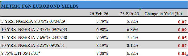 Overall, the average Nigerian Eurobond benchmark yield widened by 6bps to close at 6.94%, reflecting broad-based risk repricing across the curve.