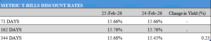 Notably, the 04-Feb-27 bill recorded a marginal uptick of 23bps to 15.68%, indicating selective interest at the far end of the curve. Consequently, the average benchmark rate inched higher by 2bps to close at 15.85%.