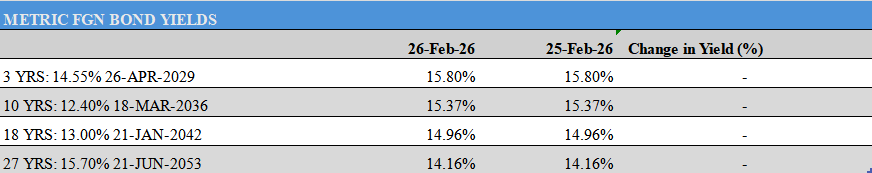 Further along the curve, the 21-Feb-34 and 18-Jul-34 bonds recorded yield increases of 7bps and 19bps to settle at 15.59% and 15.68%, respectively, while longer-dated instruments remained largely unchanged.