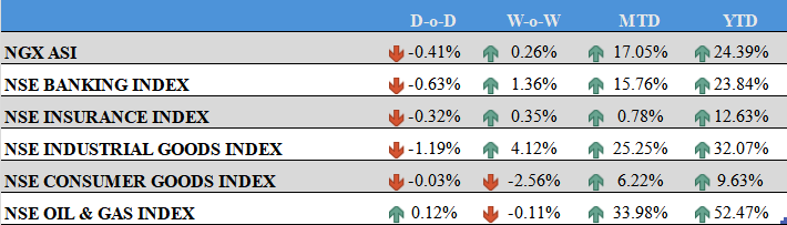 The Nigerian bourse closed the session on a negative note, as the All-Share Index (ASI) declined by 41bps. Nonetheless, the market retained a solid 24.39% year-to-date (YTD) return. Similarly, the Pension Index shed 56bps on the day but continues to reflect a strong 31.91% YTD gain.