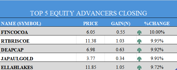 - Oil and Gas Index advanced by 12bps, supported by JAPAULGOLD (+9.91%) and OANDO (+1.75%).